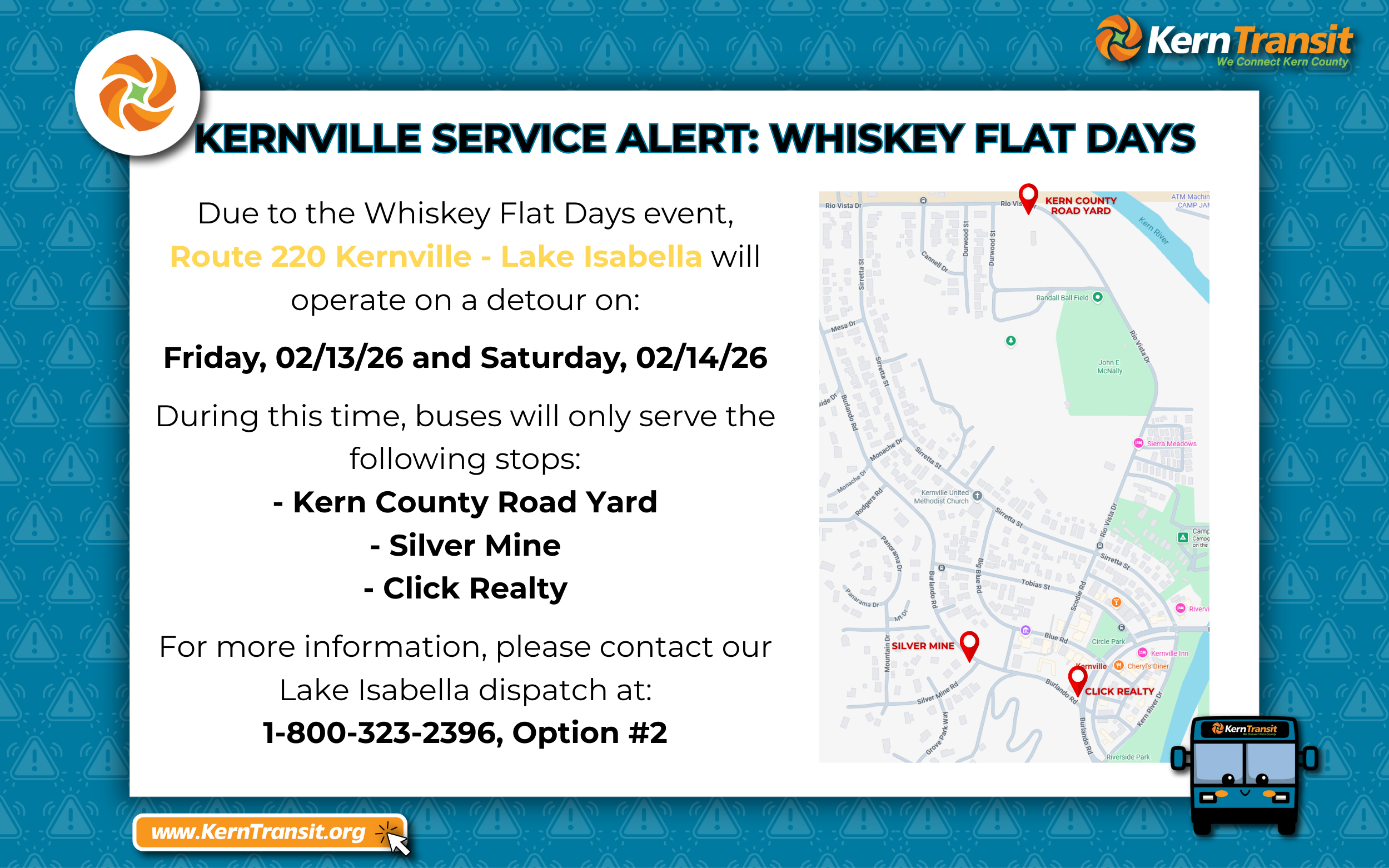 Due to the Whiskey Flat Days event in Kernville, Route 220 will operate on a temporary detour on: